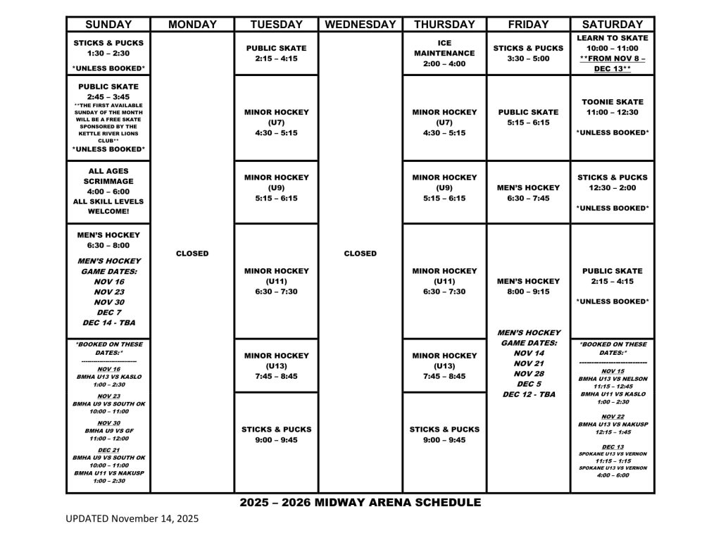 Sat Nov 22 12:15pm U13 vs Nakusp Sun Nov 23 10:00am U9 vs South OK Sun Nov 30 11:00am U9 vs Grand Forks Sun Dec 21 10:00am U9 vs South OK Sun Dec 21 1:00pm U11 vs Nakusp Sat Jan 3 11:00am U11 vs Nelson 2 Sun Jan 4 12:00pm U13 vs Castlegar 1 Sun Jan 11 12:00pm U11 vs Nelson 1 Sun Feb 1 10:00am U9 vs South OK Fri Feb 6 5:00pm U13 vs Grand Forks Sun Feb 8 10:00am U9 vs South OK Sat Feb 21 11:00am U11 vs Castlegar 1