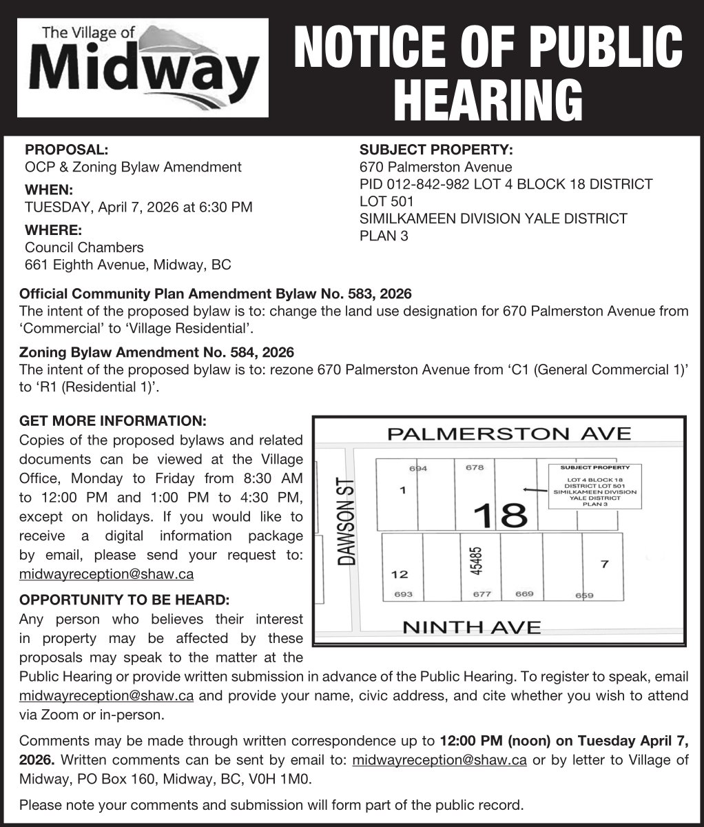 Notice of Public Hearing – OCP & Zoning Bylaw Amendment
